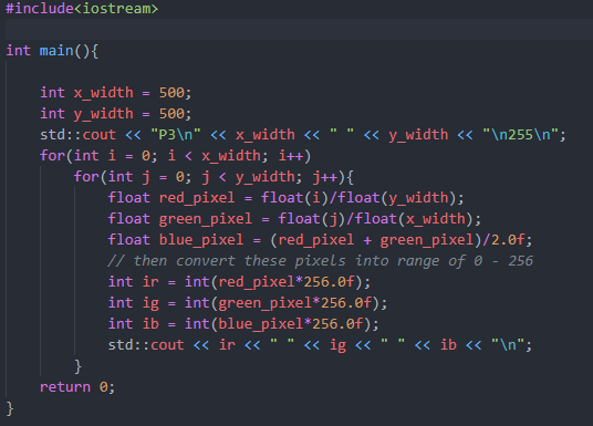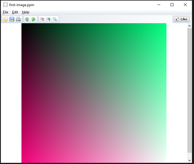 Let's output an image by simply iterating through pixel positions and printing their colours. To read these pixel values, we can use software that's able to read .ppm files.